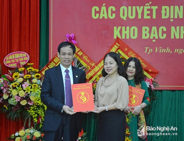Ngày 1/4, Phó Tổng Giám đốc Kho bạc Nhà nước Đặng Thị Thủy đã trao Quyết định số 1468/QĐ-KBNN ngày 28/3/2019 của Kho bạc Nhà nước về việc tiếp nhận và bổ nhiệm có thời hạn đồng chí Nguyễn Đình Hòa, Bí thư Thị ủy Thái Hòa giữ chức Giám đốc Kho bạc Nhà nước Nghệ An từ ngày 1/4/2019 (thay đồng chí Hoàng Thị Xuân, Giám đốc Kho bạc Nhà nước Nghệ An nghỉ hưu theo chế độ).