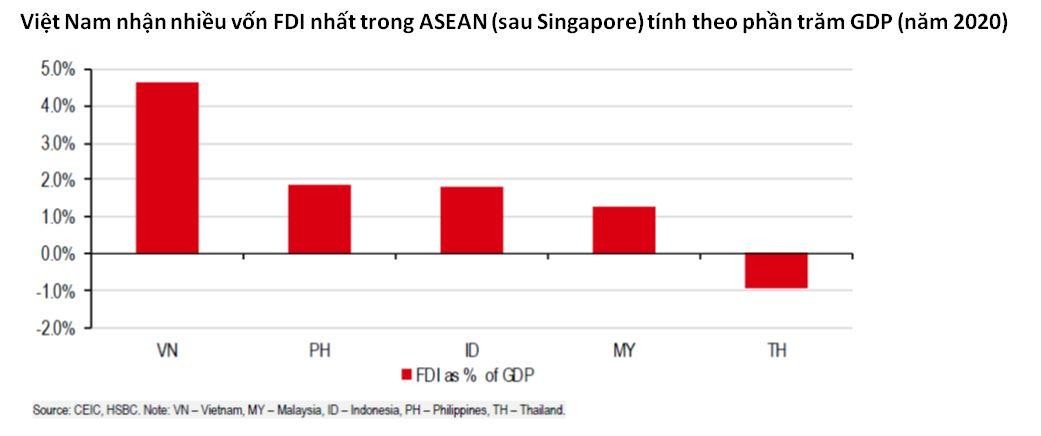 Đầu tư trực tiếp nước ngoài (FDI) và xuất khẩu là động lực chính cho tăng trưởng kinh tế Việt Nam. Ví dụ, quốc gia này là một trong những nước hưởng lợi lớn từ sự chuyển hướng chuỗi cung ứng của châu Á và cũng nhận được nhiều vốn FDI nhất ở ASEAN, sau Singapore, tính theo tỷ lệ phần trăm GDP.