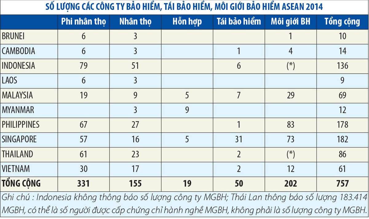 Về số lượng công ty, Việt Nam có 30 công ty trong tổng số 331 công ty bảo hiểm phi nhân thọ đang hoạt động tại thị trường ASEAN, tương đương tỷ lệ 9%, đứng thứ 5 sau Indonesia (79 công ty), Philippines (67 công ty), Thái Lan (61 công ty), Singapore (57 công ty).
