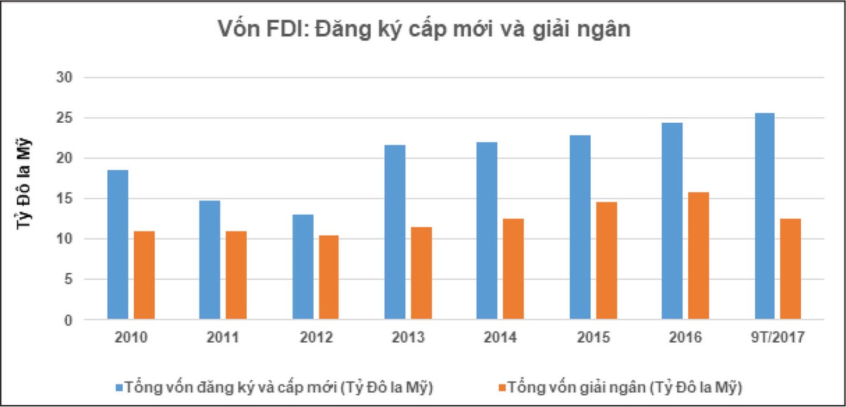 Theo thống kê của Bộ Kế hoạch và Đầu tư, trong 9 tháng đầu năm 2017, lượng vốn đầu tư nước ngoài đăng ký mới và tăng thêm đạt xấp xỉ 25,5 tỷ USD, tăng khoảng 34,3% so với cùng kỳ năm trước. Vốn đầu tư trực tiếp nước ngoài (FDI) giải ngân tăng xấp xỉ 13,4% so với cùng kỳ năm ngoái, đạt 12,5 tỷ USD. Trong đó, Hàn Quốc là nhà đầu tư dẫn đầu với gần 6,3 tỷ USD, theo sau là Nhật Bản và Singapore với số vốn đầu tư lần lượt là 5,9 tỷ USD và 4,1 tỷ USD.