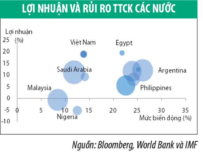 Bên cạnh đó, VN-Index của Việt Nam có mức sinh lời đứng ở vị trí thứ hai trong quý I vừa qua, chỉ sau Case của Ai cập, trong khi chỉ số rủi ro - dựa trên biến động Index 200 ngày của VN-Index (13,8%) thấp hơn khá nhiều so với Case (21,8%). Những nỗ lực tái cấu trúc nền kinh tế và giữ ổn định các chính sách tài chính tiền tệ của Việt Nam đã phần nào được phản ánh vào sự ổn định của thị trường. Trong 2 năm gần đây, chỉ số lạm phát cũng như biến động tỷ giá được giữ ở mức ổn định. Sau Ả Rập Saudi, đồng Việt Nam có mức biến động thấp nhất từ năm 2012 đến nay.