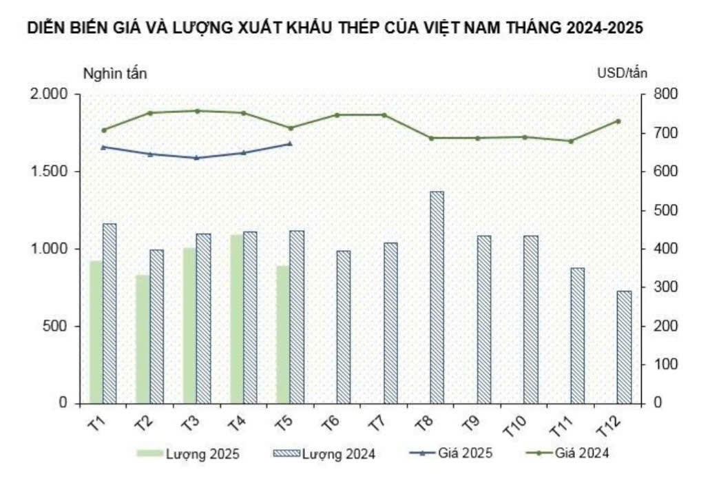 Tuy nhiên, lũy kế 6 tháng đầu năm, tổng sản lượng xuất khẩu đạt 5,66 triệu tấn, trị giá 3,70 tỷ USD, giảm 13% về lượng và giảm tới 22,5% về giá trị so với cùng kỳ năm 2024. Nguyên nhân chủ yếu đến từ sự lao dốc của giá thép trên thị trường quốc tế, khiến kim ngạch xuất khẩu giảm mạnh hơn mức sụt giảm về sản lượng.