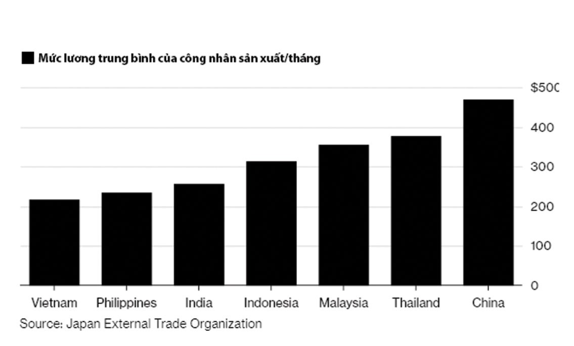 Các công nhân sản xuất tại Việt Nam được trả lương trung bình 216 USD/tháng, chưa bằng một nửa so với những người làm công việc tương đương tại Trung Quốc. Bên cạnh đó, nhờ Chính phủ trợ giá điện, chi phí cho điện năng đang ở mức 7 cents Mỹ/kWh, thấp hơn so với mức 10 cents/kWh tại Indonesia và 19 cents/kWh tại Philippines, theo số liệu của GlobalPetrolPrices.com.