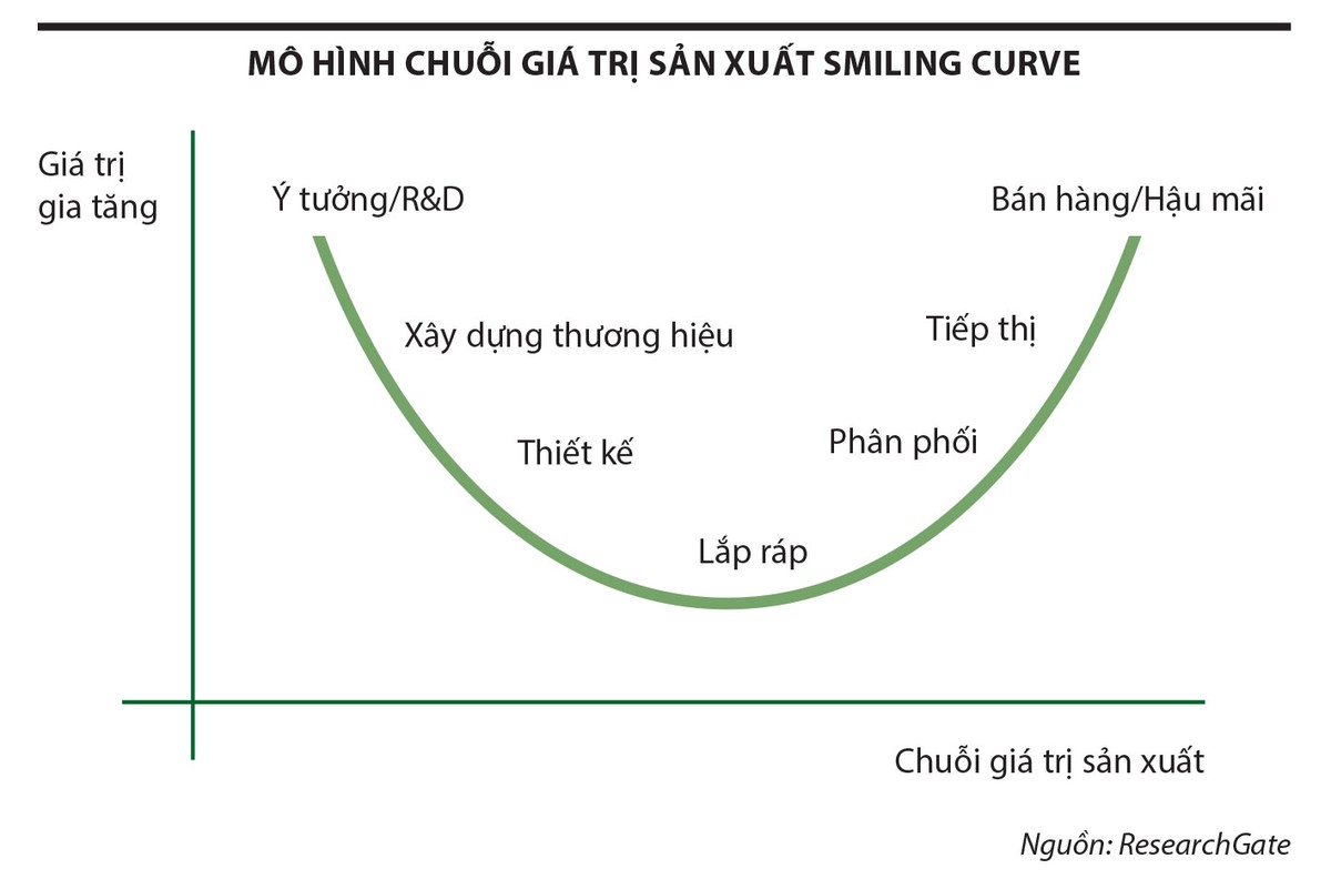 Theo mô hình Smiling Curve (do ông Stan Shih, Chủ tịch hãng máy tính Acer phát triển năm 1992), các doanh nghiệp Việt Nam tập trung ở công đoạn lắp ráp (manufacturing) - vốn tạo ra giá trị gia tăng thấp. Công đoạn này đòi hỏi lao động cường độ cao, tức là vốn trên mỗi lao động thấp. Doanh nghiệp gia công lắp ráp phải đối mặt với các yêu cầu khắt khe từ nhà cung cấp nguyên liệu và nhà phân phối, thương hiệu, làm suy yếu khả năng đàm phán trong chuỗi giá trị.