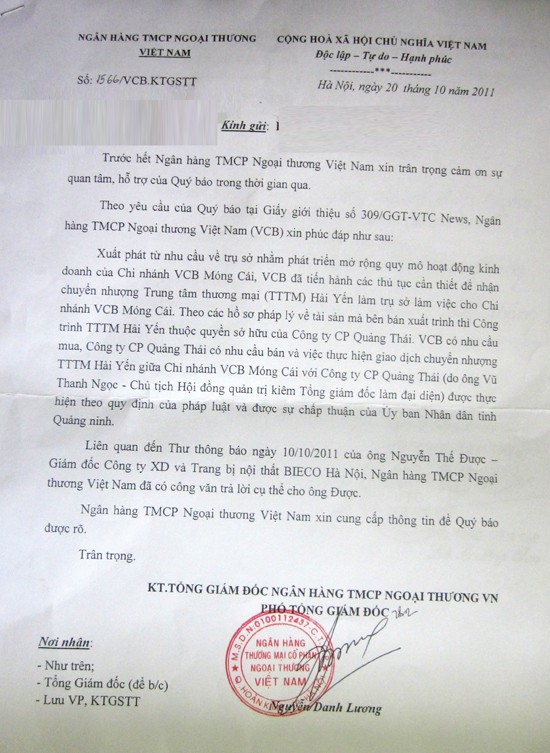 Trong khi đó, trả lời báo chí, lãnh đạo Vietcombank khẳng định, ngân hàng này đã thực hiện thương vụ mua bán dự án Trung tâm thương mại Hải Yến một cách hợp lệ. "Xuất phát từ nhu cầu mở rộng hoạt động kinh doanh của Vietcombank Chi nhánh Móng Cái, Vietcombank đã tiến hành các thủ tục cần thiết để nhận chuyển nhượng Trung tâm thương mại Hải Yến. Theo các hồ sơ pháp lý mà bên bán xuất trình, Trung tâm thương mại Quảng Thái thuộc quyền sở hữu của CTCP Quảng Thái (do ông Vũ Thanh Ngọc, Chủ tịch HĐQT kiêm Tổng giám đốc làm đại diện) được thực hiện theo quy định của pháp luật và được sự chấp thuận của UBND tỉnh Quảng Ninh", ông Nguyễn Danh Lương, Phó tổng giám đốc Vietcombank cho hay.