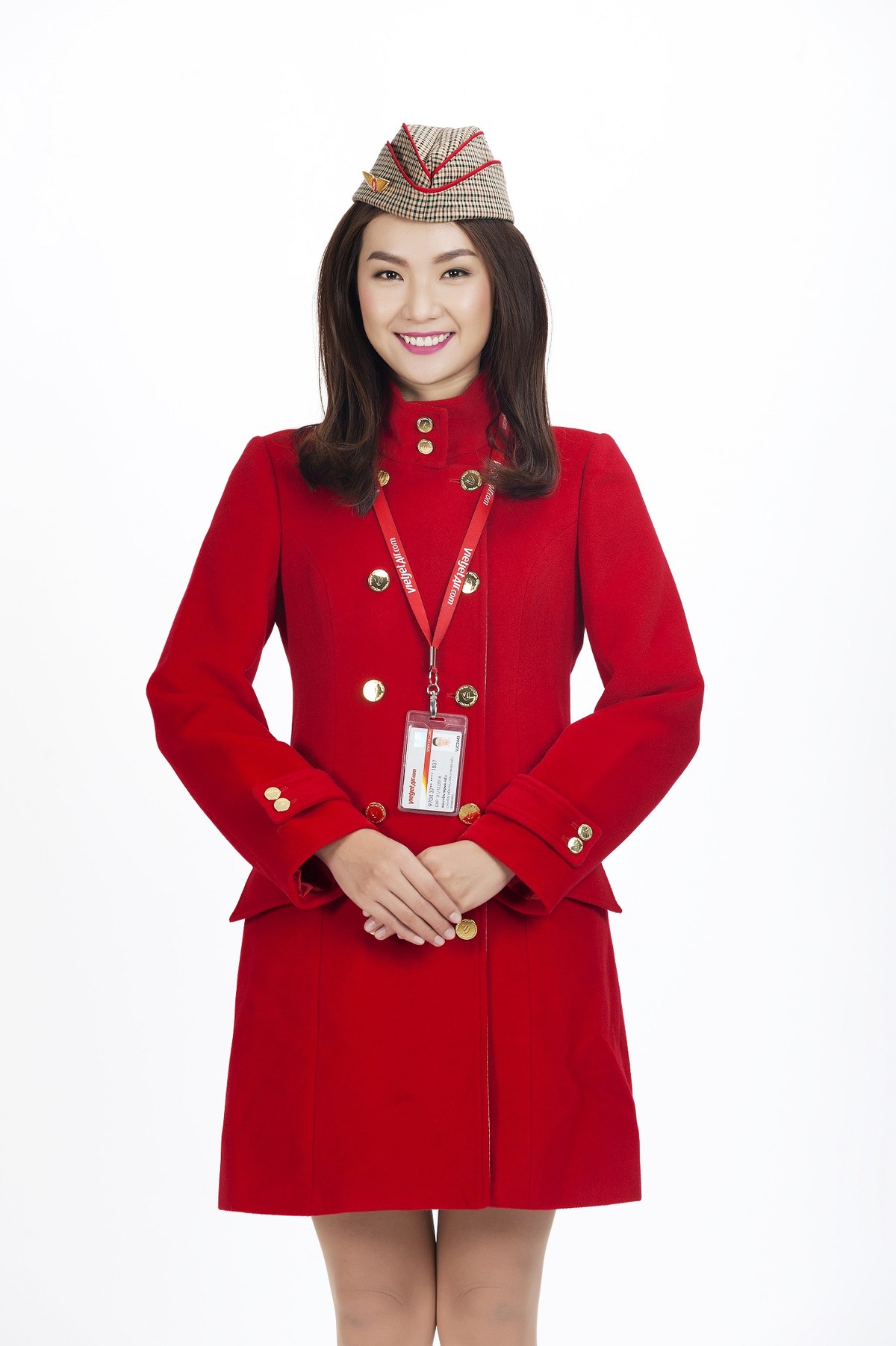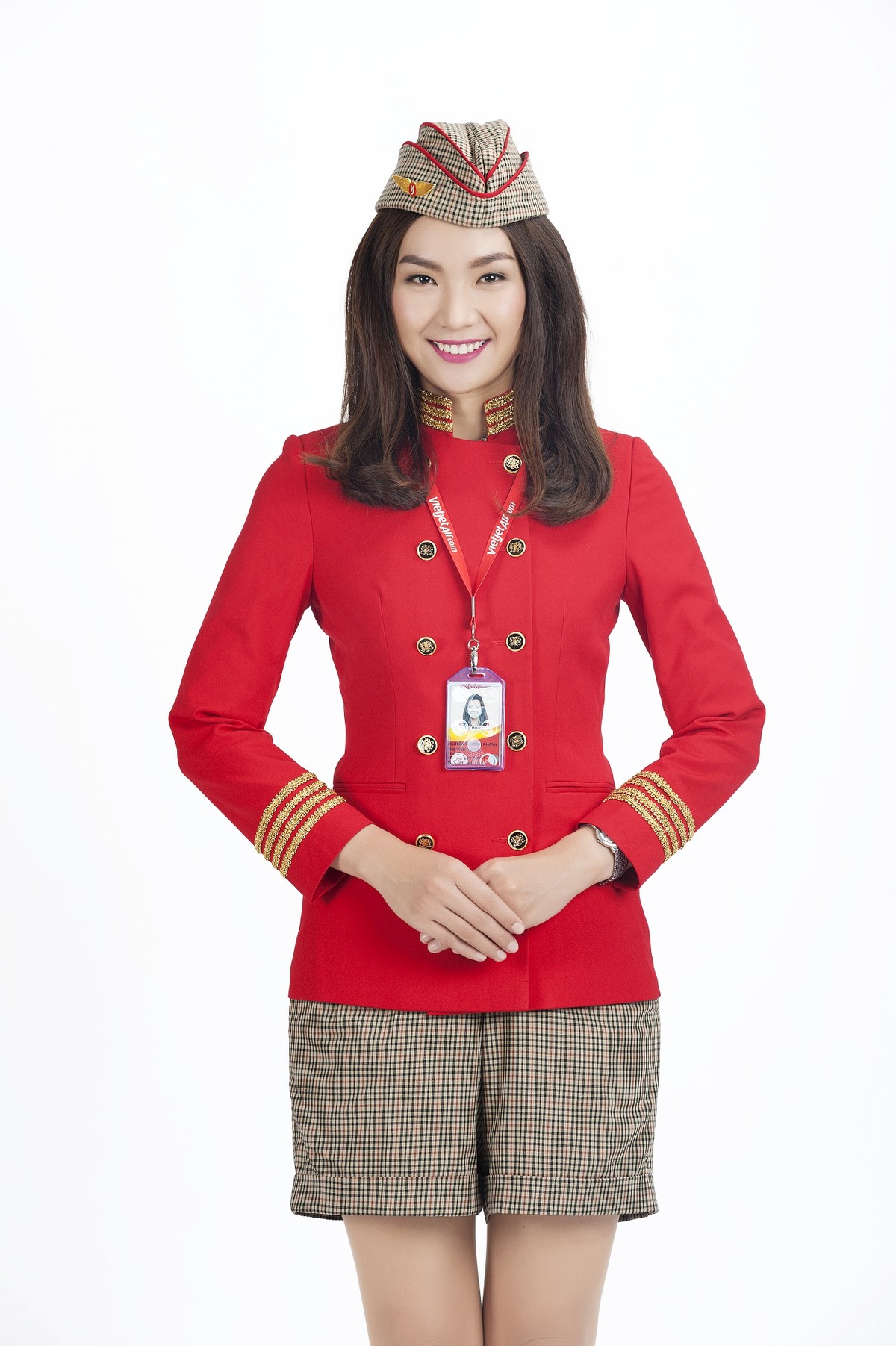 Đồng phục tiếp viên Vietjet được nhà thiết kế châu Âu thực hiện dựa trên ý tưởng đồng phục của thiếu sinh quân trong đội vệ quốc quân. Đối với tiếp viên nữ, áo thun đỏ cách điệu, thắt nơ trên cổ, quần soóc kèm theo mũ ca-lô kẻ sọc và các phụ kiện như cánh bay, huy hiệu, thắt lưng nâu và đôi giày búp bê đỏ xinh xắn tạo điểm nhấn cho trang phục.
