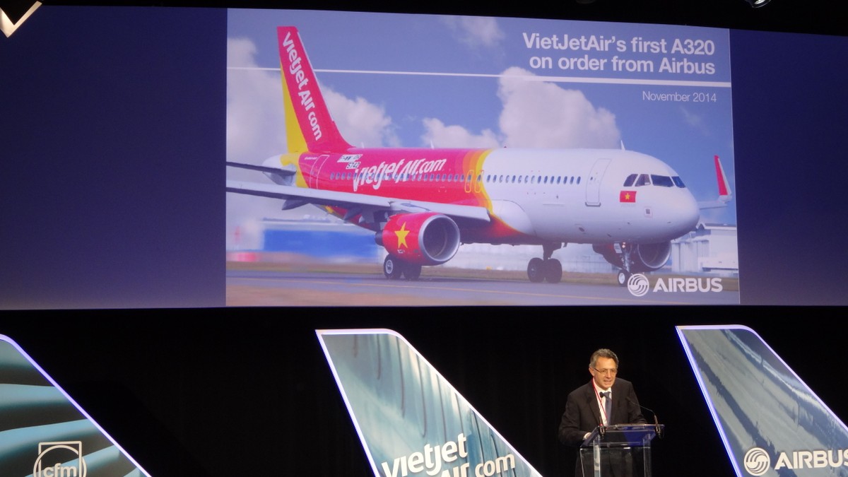 Phó chủ tịch Tập đoàn CFM - hãng cung cấp động cơ và dịch vụ bảo dưỡng cho dòng máy bay Airbus của Vietjet phát biểu tại buổi lễ tổ chức tại Toulouse ngày 26/11/2014