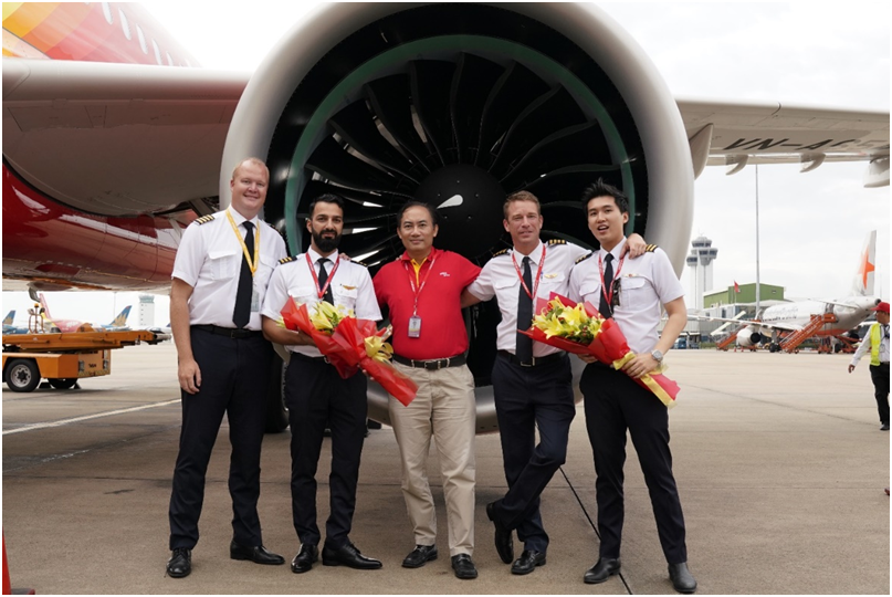 Phó Tổng giám đốc Tô Việt Thắng chúc mừng đoàn công tác về cùng tàu bay mới.