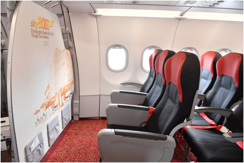 Tàu bay A321neo của Vietjet có thiết kế thông thoáng với ghế da êm ái, sàn lót thảm cao cấp, các dãy ghế đầu được dành riêng để phục vụ khách hàng Skyboss.
