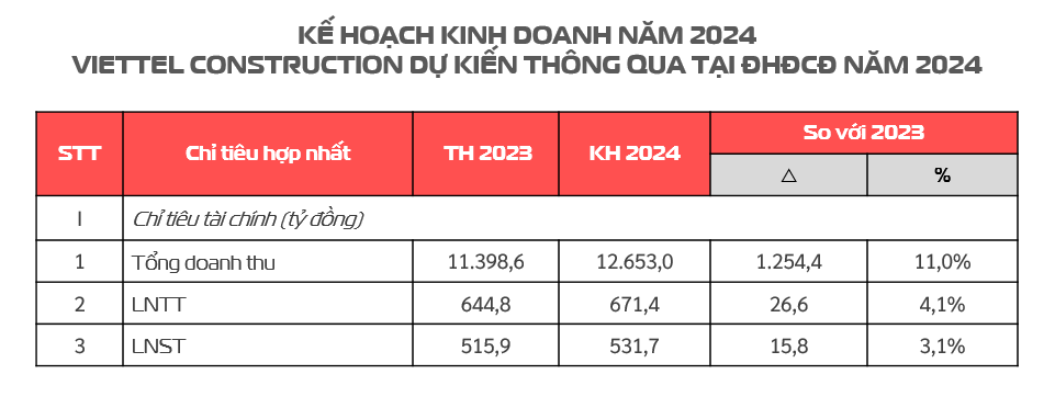 Viettel Construction dự kiến sẽ trình cổ đông thông qua kế hoạch kinh doanh với doanh thu hợp nhất đạt 12.653 tỷ đồng (tăng trưởng 11% so với 2023), lợi nhuận trước thuế đạt 671,4 tỷ đồng (tăng trưởng 4,1% so với năm 2023).