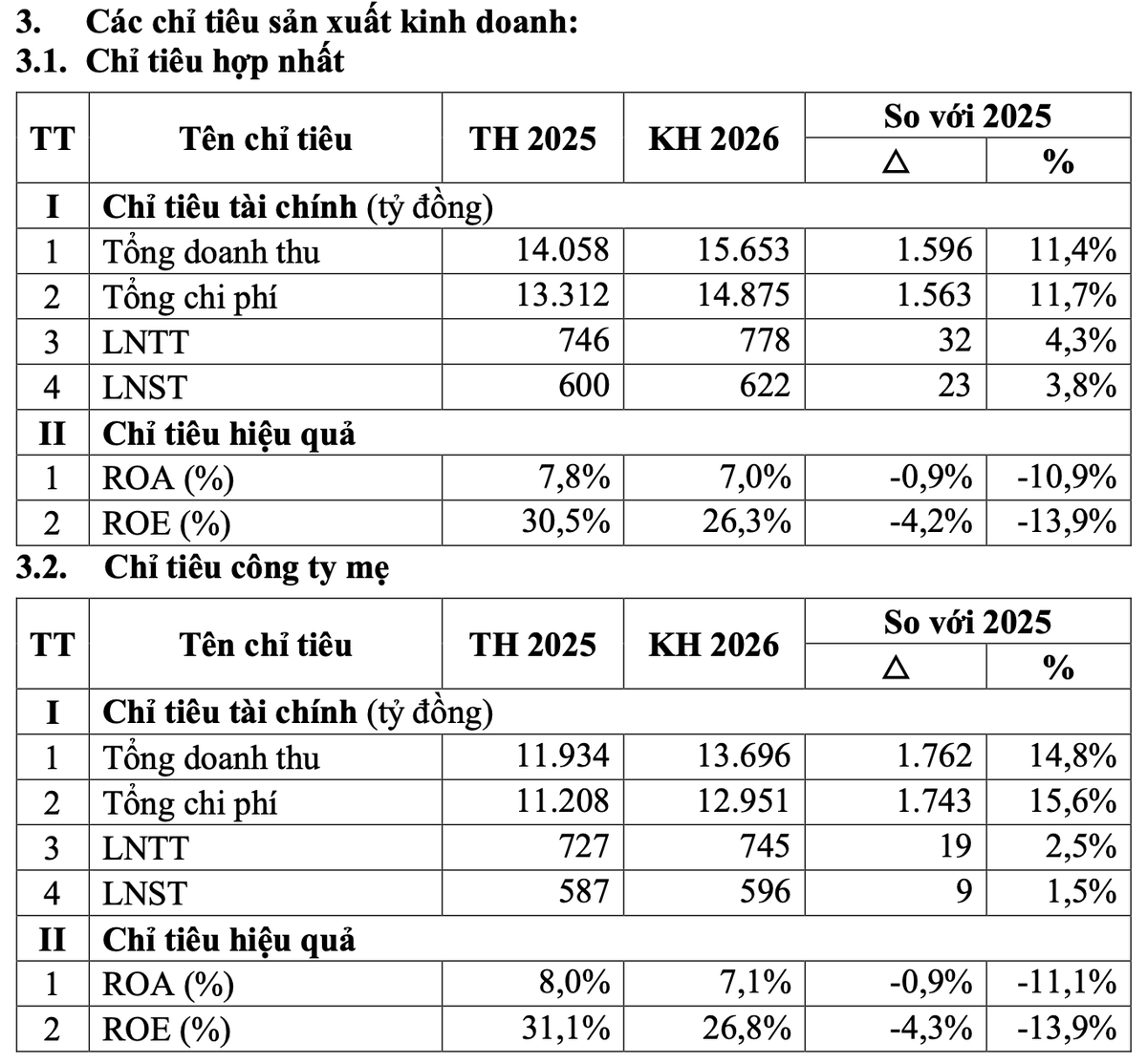 Năm 2026, Công ty đặt mục tiêu tổng doanh thu đạt 15.653 tỷ đồng, tăng 11% so với năm trước. Theo đó, lợi nhuận sau thuế đạt 622,4 tỷ đồng, tăng 3,8%. Trong đó, tổng doanh thu của Công ty mẹ đạt 13.696 tỷ đồng và lợi nhuận sau thuế 596 tỷ đồng; ROE đạt 26,8%.