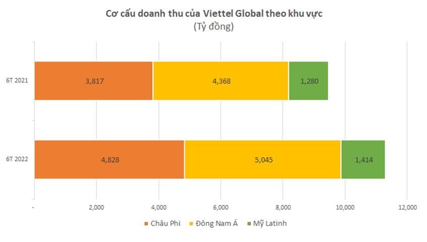 Về các thị trường mà Viettel Global đầu tư và hợp nhất doanh thu, châu Phi vẫn duy trì tốc độ tăng trưởng tốt nhất khi đóng góp hơn 4.800 tỷ (tăng 26%). Thị trường Đông Nam Á đạt 5.045 tỷ (tăng 15%), còn lại là Mỹ La-tinh đạt 1.414 tỷ (tăng 10%).