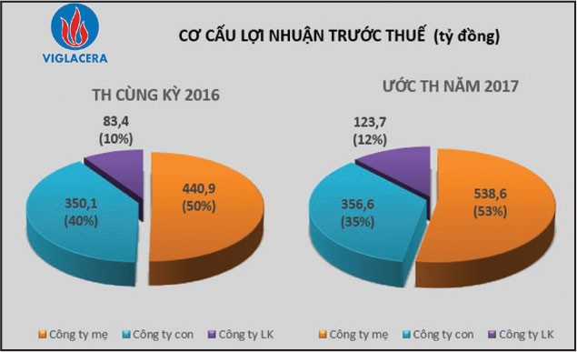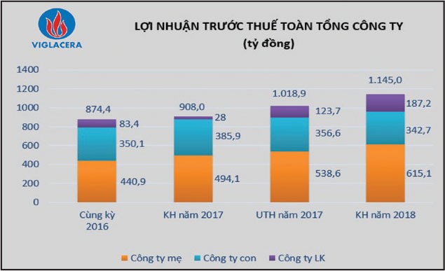Theo thông tin từ Tổng công ty Viglacera (VGC), năm 2017, các chỉ tiêu chính của Tổng công ty đều vượt kế hoạch đặt ra và tăng trưởng mạnh so với năm 2016. Cụ thể, lợi nhuận trước thuế hợp nhất của toàn Tổng công ty đạt 1.019 tỷ đồng, vượt 12% kế hoạch năm, tăng 144 tỷ đồng so với thực hiện năm 2016. Đây là năm đầu tiên đánh dấu mức lợi nhuận của toàn Tổng công ty vượt trên 1.000 tỷ đồng. Doanh thu hợp cộng toàn Tổng công ty đạt 16.486 tỷ đồng, đạt 102% so với kế hoạch năm, tăng 13% so với thực hiện năm 2016.
