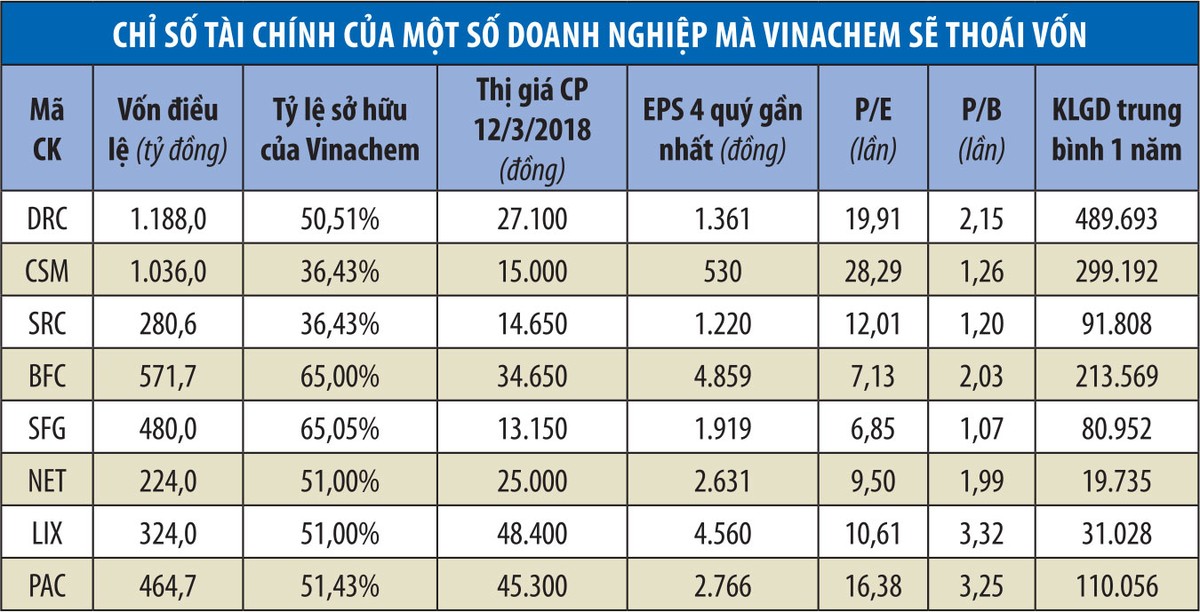 Theo kế hoạch, Vinachem sẽ chỉ còn nắm giữ 36% vốn điều lệ tại các doanh nghiệp gồm Công nghiệp Cao su Miền Nam (CSM), Cao su Đà Nẵng (DRC), Cao Su Sao Vàng (SRC), Phân bón Bình Điền (BFC), Phân bón Miền Nam (SFG), Bột giặt Net (NET), Bột giặt Lix (LIX), Pin Ắc quy Miền Nam (PAC), Phân bón và Hóa chất Cần Thơ.