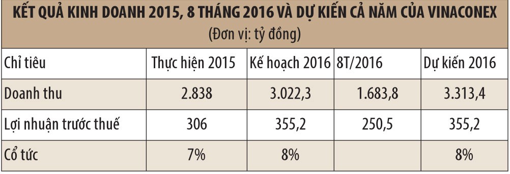 Cũng tại sự kiện này, Vinaconex đã công bố kết quả thực hiện kế hoạch sản xuất - kinh doanh 8 tháng và dự kiến mức độ hoàn thành cả năm 2016.