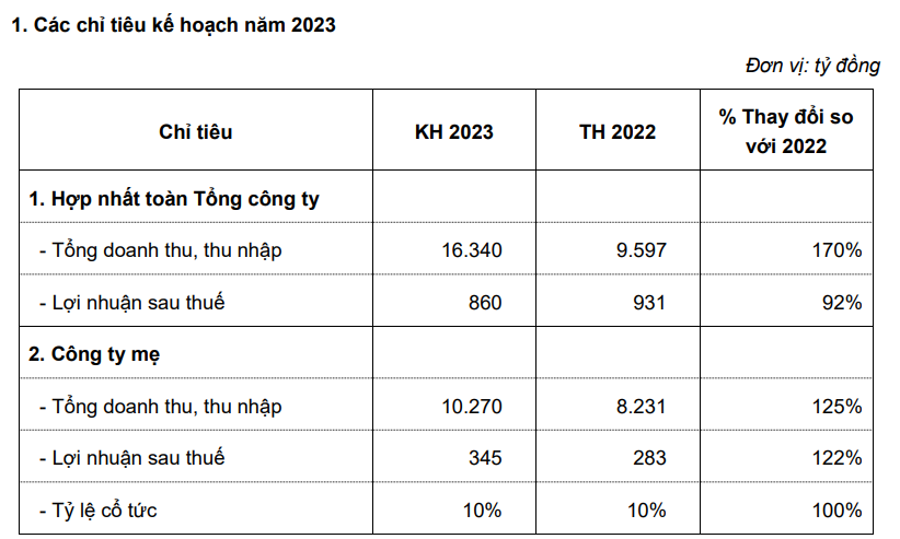 Với riêng công ty mẹ, doanh thu kế hoạch là 10.270 tỷ đồng, lợi nhuận sau thuế là 345 tỷ đồng, tăng lần lượt 25% và 22% so với thực hiện năm 2022, cổ tức duy trì 10%, bằng năm 2022.