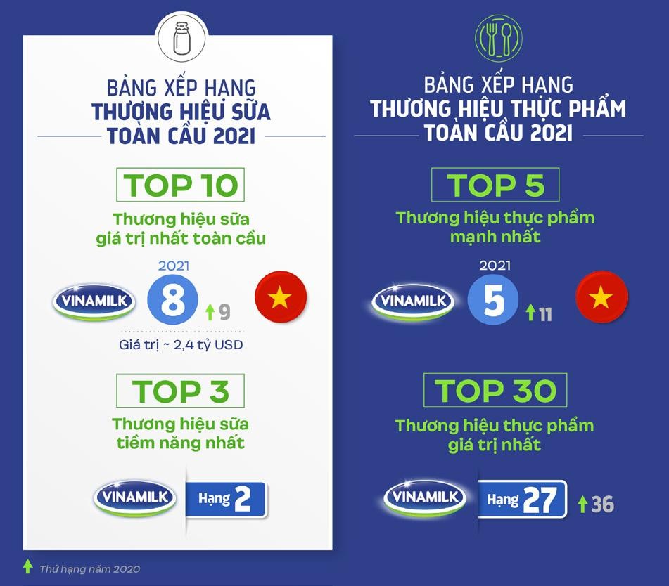 Năm 2021 là năm ghi dấu thành công của Vinamilk trên nhiều “mặt trận”, đặc biệt ở vị trí thương hiệu. Theo bảng xếp hạng của Brand Finance - nhà tư vấn định giá thương hiệu hàng đầu thế giới có trụ sở chính tại Anh, Vinamilk là đại diện duy nhất của khu vực Đông Nam Á trong “Top 10 thương hiệu sữa giá trị nhất toàn cầu năm 2021 với vị thứ 8/10”, với giá trị thương hiệu được định giá gần 2,4 tỷ USD, tăng 12% so với năm 2020. Ngoài ra, Vinamilk cũng là 1 trong 3 thương hiệu tiềm năng nhất của ngành sữa thế giới với số điểm đánh giá cao thứ 2.