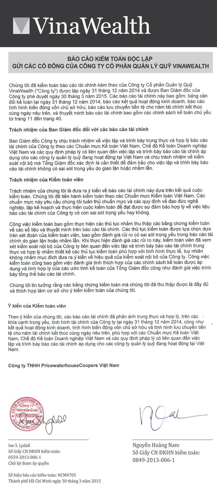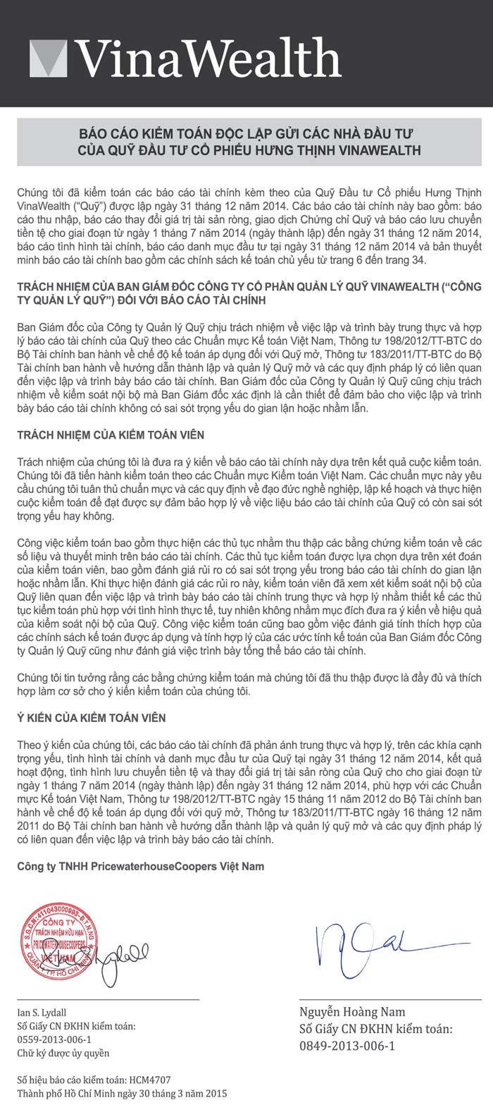 VinaWealth công bố BCTC kiểm toán 2014 của các quỹ