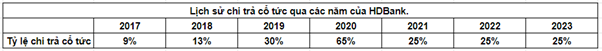 Đáng chú ý, ngân hàng HDBank dự kiến trả cổ tức năm 2024 lên đến 30%, bao gồm tiền mặt và cổ phiếu. Như vậy, sau hơn 1 thập kỷ tăng trưởng cao và liên tục, HDBank luôn thực hiện truyền thống chi trả cổ tức đều đặn hàng năm với tỷ lệ cao.