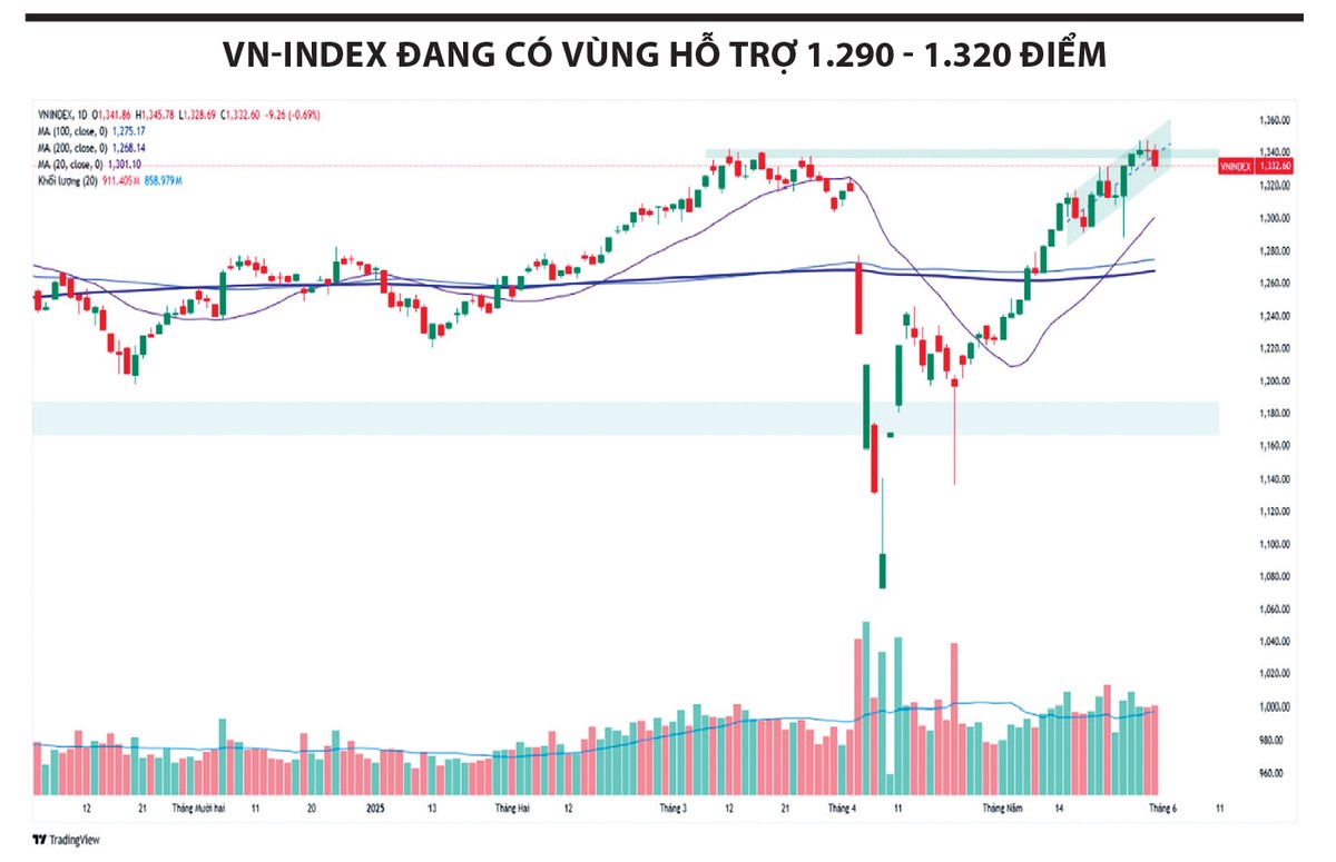 Đà tăng của thị trường đang chậm lại khi VN-Index tiến gần đến vùng đỉnh cũ quanh 1.340 điểm, kèm theo sự rung lắc. Mặc dù xu hướng kỹ thuật ngắn và trung hạn chưa bị phá vỡ, nhưng áp lực điều chỉnh đang lan rộng, do nhiều cổ phiếu mất vùng hỗ trợ ngắn hạn, làm gia tăng rủi ro trong ngắn hạn. Mặc dù vậy, vùng hỗ trợ hiện tại được nâng lên 1.290 - 1.320 điểm, đóng vai trò theo dõi phản ứng thị trường nếu áp lực điều chỉnh gia tăng. Đồng thời, kỳ vọng lực cầu sẽ tích cực trở lại, giúp thị trường sớm cân bằng và nối lại xu hướng tăng.