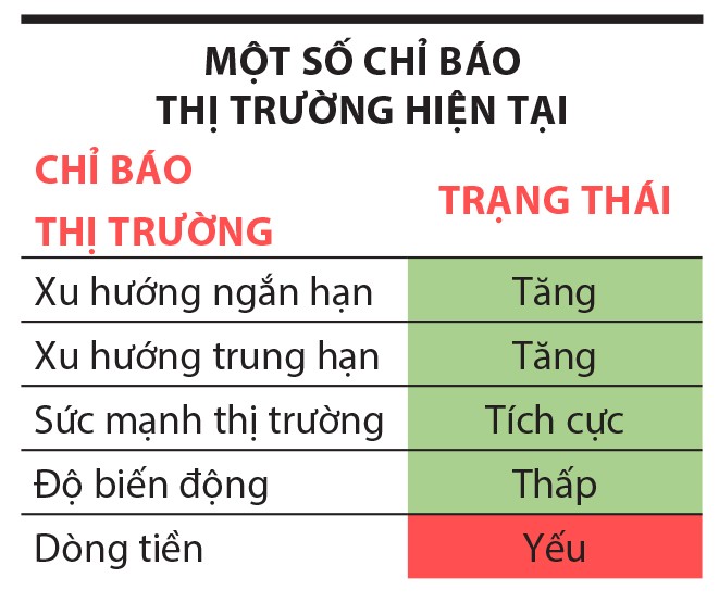 Theo chúng tôi đánh giá, thị trường hiện tại đang có 4/5 chỉ báo quan trọng trong trạng thái tích cực. Việc thỏa mãn càng nhiều tiêu chí thì thị trường càng có xác suất cao để tiếp tục đà tăng ngắn hạn. Tuy nhiên, yếu tố dòng tiền vẫn đang ở trạng thái yếu, điều này đồng nghĩa với xu thế tăng của thị trường sẽ không mạnh và sự lan tỏa không quá rộng, mà diễn biến tích cực mang tính cục bộ ở một vài nhóm ngành có câu chuyện hấp dẫn dòng tiền như đầu tư công, chứng khoán, bất động sản công nghiệp, dầu khí.