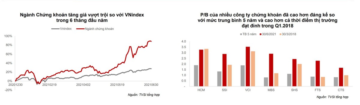 "Chúng tôi cho rằng mức P/B 2 lần là hấp dẫn đối với các công ty đầu ngành như HCM, SSI, VCI.", báo cáo nhận định.