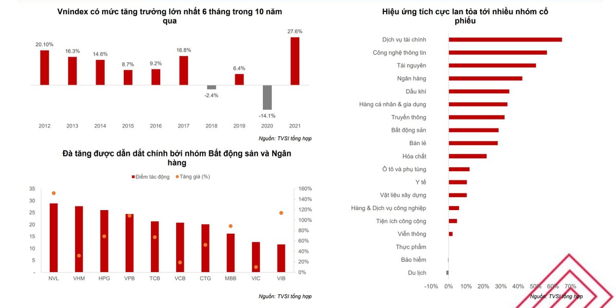Đối với riêng thị trường chứng khoán, chỉ số VN-Index đã tăng 27,6% trong 6 tháng 2021 (cao nhất tại 1.408,5 điểm), được hỗ trợ bởi kết quả kinh doanh quý I tích cực của các nhóm ngành, đặc biệt là ngân hàng, cùng triển vọng kinh tế hồi phục mạnh mẽ sau thời gian bị ảnh hưởng bởi Covid-19.