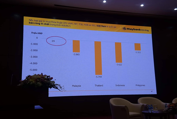 Tính từ đầu năm đến nay, Việt Nam là quốc gia duy nhất trong khối Asean -5 duy trì được giá trị mua ròng của khối ngoại, khoảng 1,4 tỷ USD nhưng phần lớn lại chảy vào các thương vụ cá biệt. Nếu loại trừ giá trị các thương vụ này, Việt Nam là thị trường có giá trị bán ròng ít nhất (khoảng 19 triệu USD).