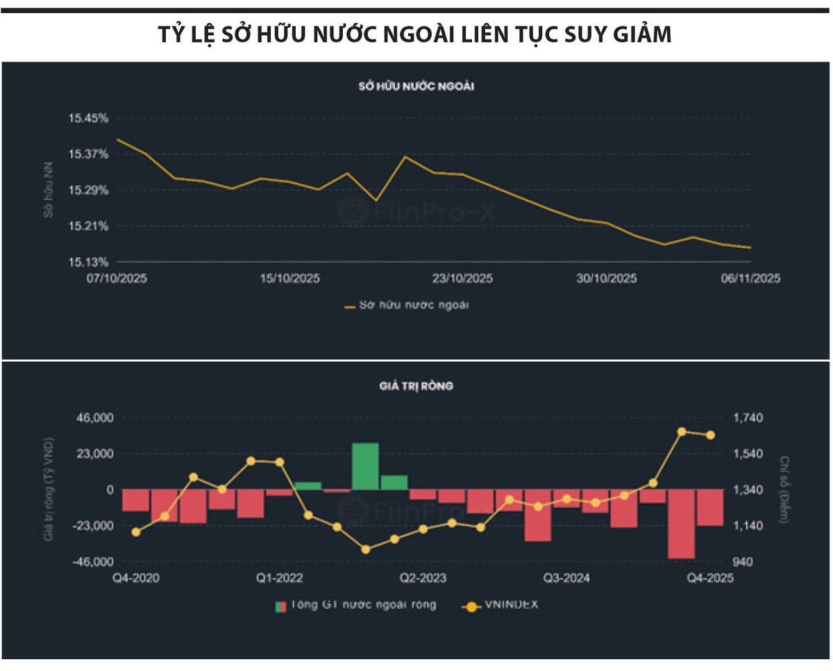 Đáng chú ý, quý III/2025 ghi nhận mức bán ròng lớn nhất của khối ngoại trong 5 năm, đưa tỷ lệ sở hữu của nhà đầu tư nước ngoài trên thị trường xuống quanh 15% - mức thấp nhất nhiều năm trở lại đây. Diễn biến này xảy ra ngay sau khi thị trường chứng khoán Việt Nam được nâng hạng, cho thấy kỳ vọng “dòng tiền ngoại trở lại” chưa thành hiện thực, thậm chí trái ngược xu hướng kỳ vọng.
