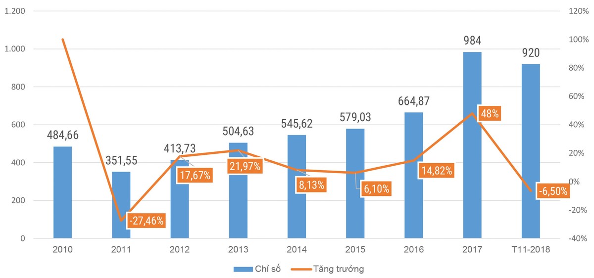 Tuy nhiên, vào tuần cuối của tháng 11, chỉ số chứng khoán Việt Nam đang có xu hướng đi chệch quỹ đạo tăng trưởng. Dao động quanh 910 - 920 điểm hiện nay, VN-Index đang có mức tăng trưởng âm 6 - 7% so với mốc chốt của chỉ số này cuối năm 2017 (984 điểm). Nhiều cổ phiếu lớn đã không tăng, thậm chí không giữ được giá như dự tính ban đầu.