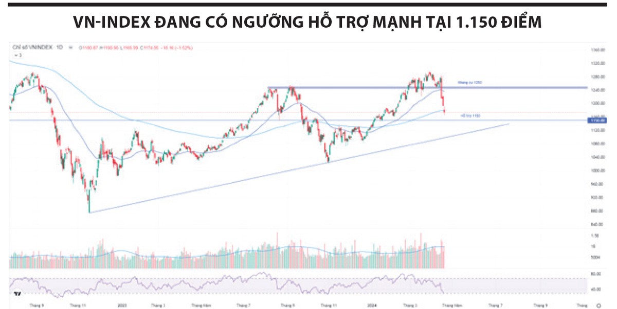 Cuối tuần qua, VN-Index đóng cửa tại 1.174,85 điểm, giảm 1,5%; với 4/5 phiên giảm điểm liên tiếp, chỉ số giảm 8% so với cuối tuần trước đó. Diễn biến giảm mạnh khiến VN-Index xuyên thủng vùng hỗ trợ 1.250 - 1.260 điểm và ngưỡng 1.200 điểm.