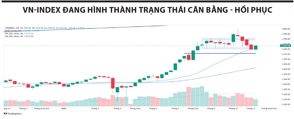 Đầu tuần, VN-Index lùi về gần 1.580 điểm dưới áp lực bán lan rộng, đặc biệt tại các cổ phiếu từng thể hiện sức chống chịu tốt trong nhịp giảm trước đó. Tuy nhiên, đà giảm không kéo dài; lực cầu bắt đáy xuất hiện giúp chỉ số nhanh chóng hồi phục và duy trì xu hướng tăng trong các phiên tiếp theo. VN-Index kết thúc tuần tại 1.635,45 điểm, tăng trở lại hơn 55 điểm từ đáy tuần.