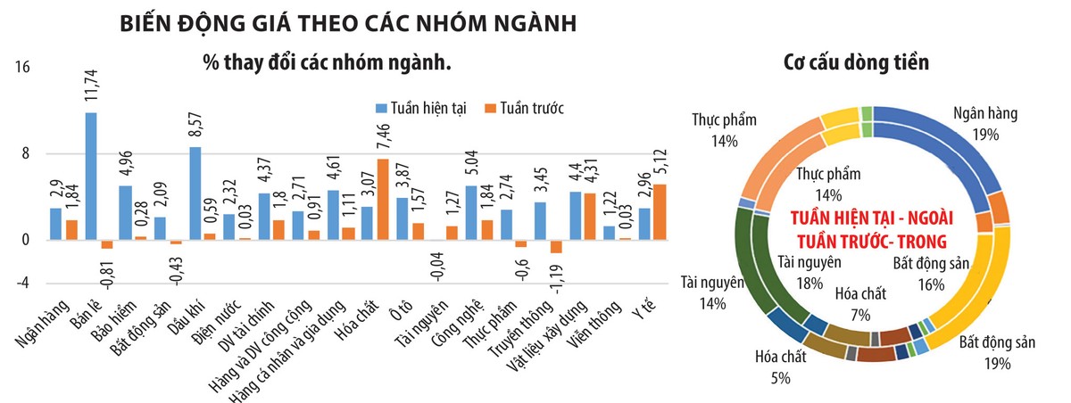 Tuần qua, một số nhóm ngành tăng điểm mạnh là bán lẻ (MWG, FRT, DGW…) tăng 11,74%, dầu khí (PLX, PVB, PVD…) tăng 8,57%, công nghệ (ELC, FPT, CMG…) tăng 5,87%, hóa chất (NHH, DGC, PLC) tăng 4,51%, xây dựng và vật liệu (VCG, C32, C4G, HT1…) tăng 4,44%.