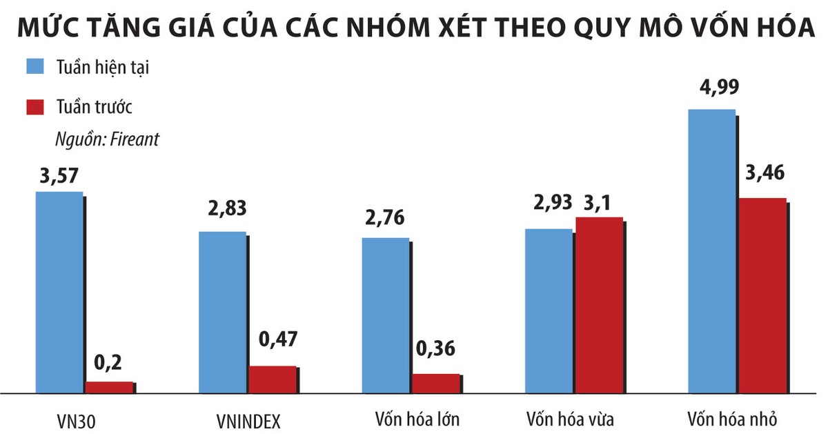 Nhóm cổ phiếu vốn hóa nhỏ có diễn biến giá tốt nhất, với mức tăng 4,99% - ghi nhận tuần giao dịch vượt mức đỉnh ngày 11/6.