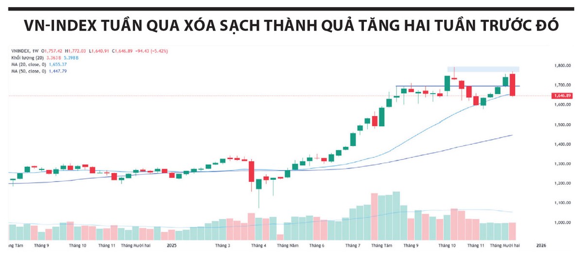 Thị trường mở đầu tuần với nhịp tăng trong vùng kháng cự tại đỉnh cũ, tuy nhiên động thái chốt lời nhanh chóng gia tăng, tập trung tại nhóm cổ phiếu họ VIN, qua đó tạo tác động đáng kể lên VN-Index. Trong bối cảnh dòng tiền hỗ trợ tại nhiều nhóm ngành suy yếu, tâm lý thận trọng lan rộng khi nhóm trụ giảm sâu, khiến áp lực bán mạnh hơn về cuối tuần và kéo tất cả các nhóm cổ phiếu đồng loạt mở rộng biên độ giảm. VN-Index đóng cửa tuần tại 1.646,89 điểm, giảm hơn 94 điểm (5,42%). Thanh khoản bình quân tuần tăng nhẹ so với tuần liền trước, chủ yếu do áp lực bán dâng cao trong phiên cuối tuần, với giá trị giao dịch bình quân đạt 18.220 tỷ đồng/phiên.