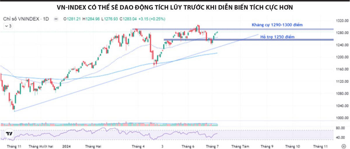 Nhìn chung, bối cảnh vĩ mô trong và ngoài nước đang có sự cải thiện. Tỷ giá ổn định trở lại khi các dữ liệu kinh tế Mỹ ủng hộ Fed giảm lãi suất, dự kiến vào tháng 9 tới. Kinh tế trong nước đang đi qua những khó khăn, hoạt động sản xuất - kinh doanh và tiêu dùng trở nên vững chãi hơn, qua đó tác động tích cực đến thị trường chứng khoán. Tâm lý thị trường được cải thiện và độ rộng của sắc xanh tăng dần qua từng phiên cho thấy, VN-Index đang nỗ lực kết thúc nhịp điều chỉnh kỹ thuật. Thời điểm hiện tại có thể nhận định, chỉ số sẽ dao động tích lũy trong vùng 1.250 - 1.290 điểm trước khi diễn biến trở nên tích cực hơn.