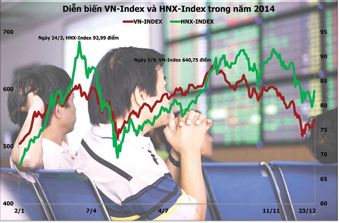 Trong quý cuối cùng của năm 2014, chỉ số VN-Index đã giảm tới 16% từ mức đỉnh, đánh mất gần như toàn bộ thành quả của cả năm. Thị trường hồi phục nhẹ trong 2 tuần cuối năm và đóng cửa ở mức 545,63 điểm vào ngày 31/12. Nhà đầu tư có lẽ không cảm thấy quá hứng thú khi thị trường kết thúc năm với mức tăng chỉ khoảng 8%. Chỉ số HNX-Index có vẻ khả quan hơn, giảm 8% trong quý IV, nhưng tăng gần 24% trong cả năm.