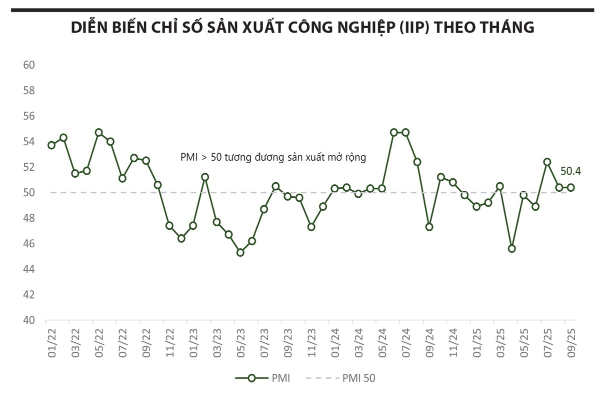 Chỉ số PMI duy trì ở mức 50,4 điểm cho thấy điều kiện kinh doanh cải thiện ba tháng liên tiếp khi đơn hàng mới phục hồi nhẹ. Dù nhu cầu quốc tế còn yếu với đơn hàng xuất khẩu giảm, tốc độ giảm đã chậm lại, xuống mức thấp nhất trong 11 tháng gần đây. Điều này phản ánh môi trường kinh tế toàn cầu dần ổn định hơn sau khi Mỹ công bố mức thuế quan mới.