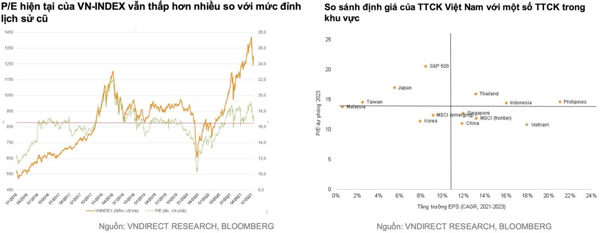 Theo ước tính của VNDIRECT, chỉ số VN-Index đang được giao dịch với mức P/E forward 2021 là 15,8 lần. Trên góc độ tăng trưởng lợi nhuận và định giá thị trường, Việt Nam là thị trường có mức định giá rất hấp dẫn xét trên triển vọng tăng trưởng lợi nhuận mạnh mẽ trong giai đoạn 2021-2023.