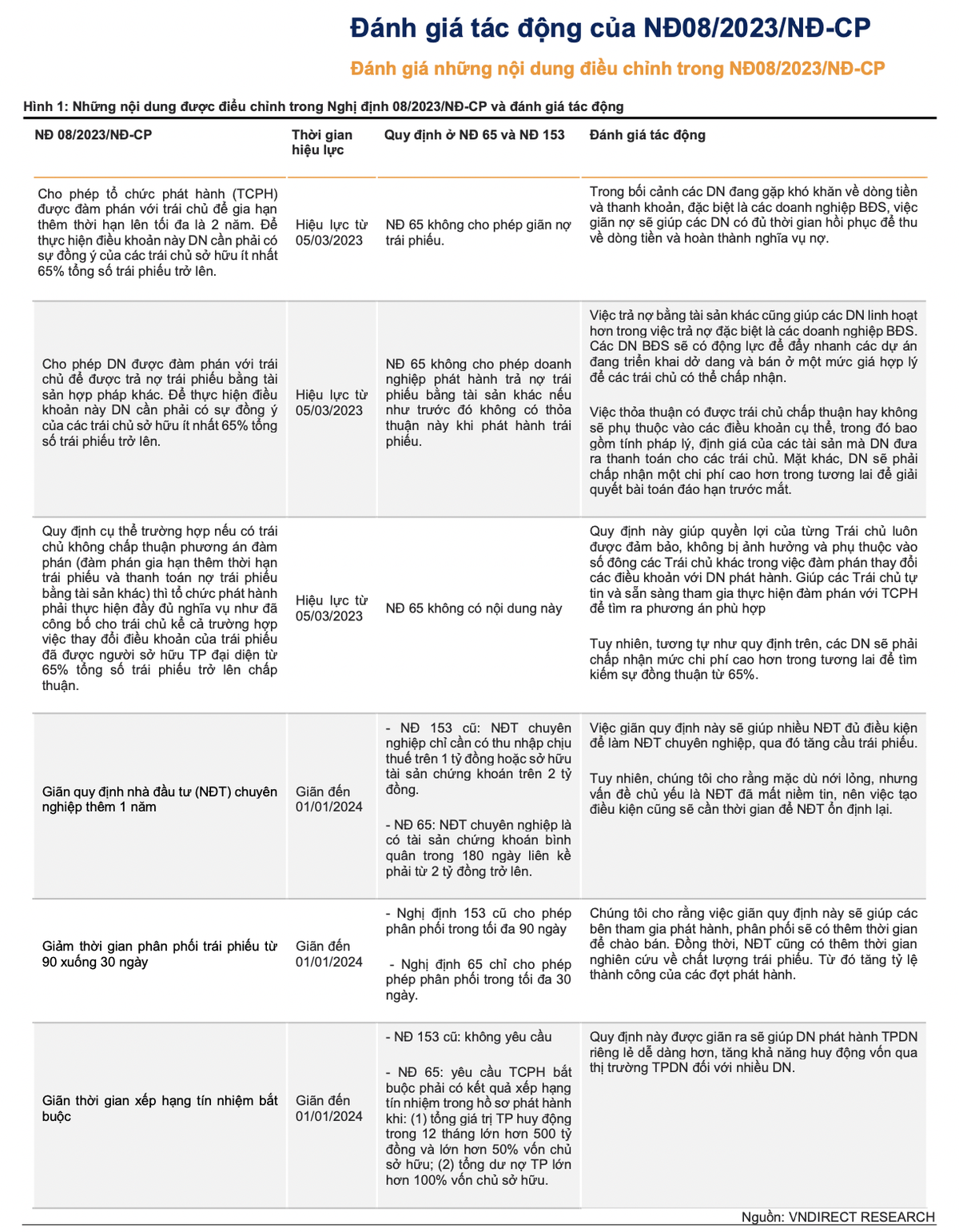 Báo cáo mới nhất vừa được VNDirect công bố cho biết, Nghị định số 08/2023/NĐ-CP ngày 5/3/2023 sửa đổi, bổ sung và ngưng hiệu lực thi hành một số điều tại các Nghị định quy định về chào bán, giao dịch trái phiếu doanh nghiệp riêng lẻ tại thị trường trong nước và chào bán trái phiếu doanh nghiệp ra thị trường quốc tế sẽ tạo ra hành lang pháp lý cần thiết để xử lý một vài điểm nghẽn hiện nay trên thị trường trái phiếu doanh nghiệp (TPDN). Cụ thể: