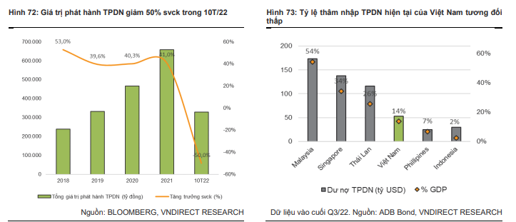 Trong Báo cáo Chiến lược đầu 2023: Đầu tư có trách nhiệm - Xây tương lai vững bền, VNDirect đánh giá, thị trường trái phiếu doanh nghiệp Việt Nam bùng nổ trong giai đoạn 2020 - 2021, tuy nhiên những rủi ro đầu tư và pháp lý đã bộc lộ qua một số sai phạm xảy ra đầu năm 2022.