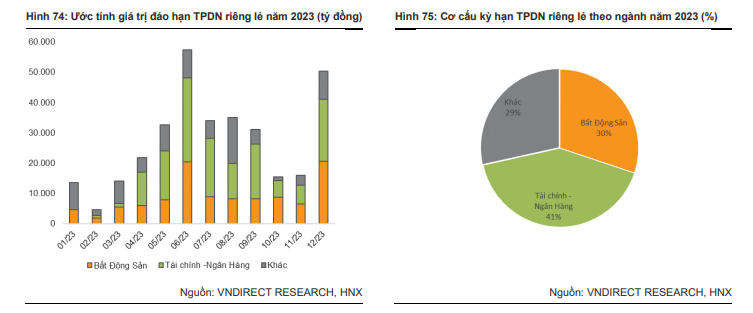Mặt khác, tổng giá trị trái phiếu riêng lẻ đáo hạn năm 2023 vào khoảng 300.000 tỷ đồng (tăng 90% so với cùng kỳ). Trong đó, bất động sản và tài chính - ngân hàng lần lượt chiếm 30% và 40%. Trong bối cảnh chính sách tiền tệ thắt chặt, chi phí tài chính gia tăng và thắt chặt phát hành trái phiếu, một số tổ chức phát hành có ít cơ hội tiếp cận nguồn vốn nhằm tái cơ cấu tài chính và đáp ứng nghĩa vụ nợ ngắn hạn.