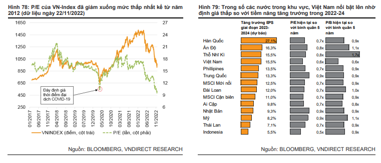 Tại ngày 22/11/2022, VN-index đang giao dịch ở mức 10 lần P/E trượt, thấp hơn 43% từ đỉnh 2022 và thấp hơn 36% so với trung bình định giá 5 năm (15,6 lần P/E). Theo VNDirect, Việt Nam vẫn khá hấp dẫn so với các thị trường khu vực trong tương quan tăng trưởng lợi nhuận giai đoạn 2023 - 2024.