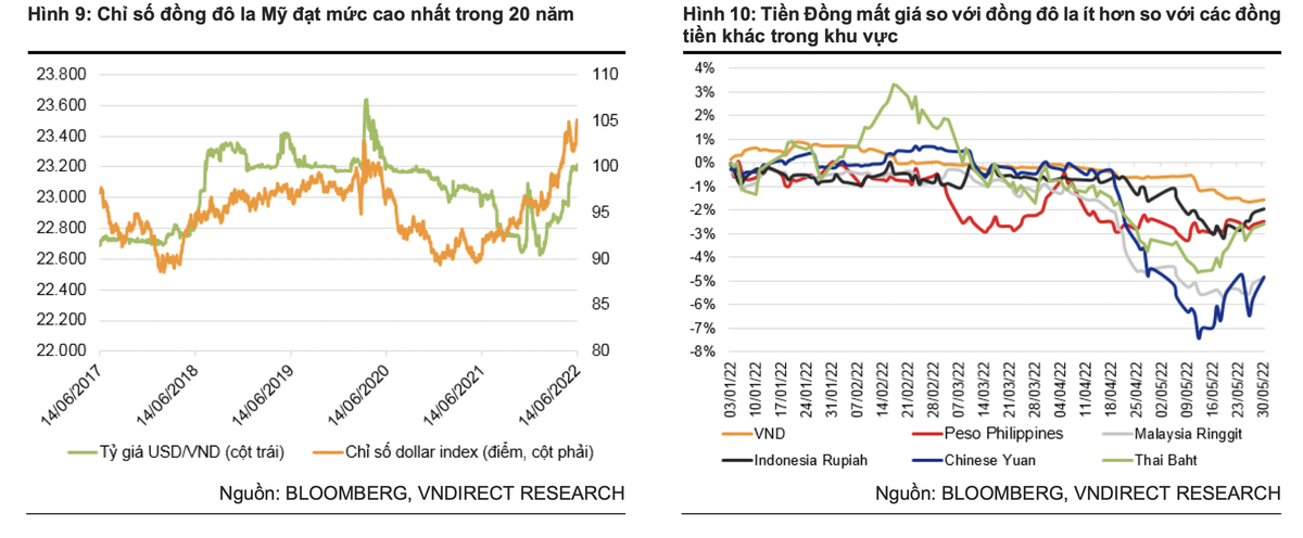 Thứ năm, đồng USD mạnh gây áp lực lên tỷ giá hối đoái của Việt Nam. Vào ngày 14/06/2022, chỉ số đồng USD (đo sức mạnh của đồng USD so với rổ tiền tệ) đạt 104,7 điểm, mức cao trong vòng 20 năm qua. Đồng USD mạnh kéo tỷ giá USD/VND tăng 1,7% kể từ đầu năm. Tuy nhiên, VND vẫn là một trong những đồng tiền ổn định nhất khu vực.