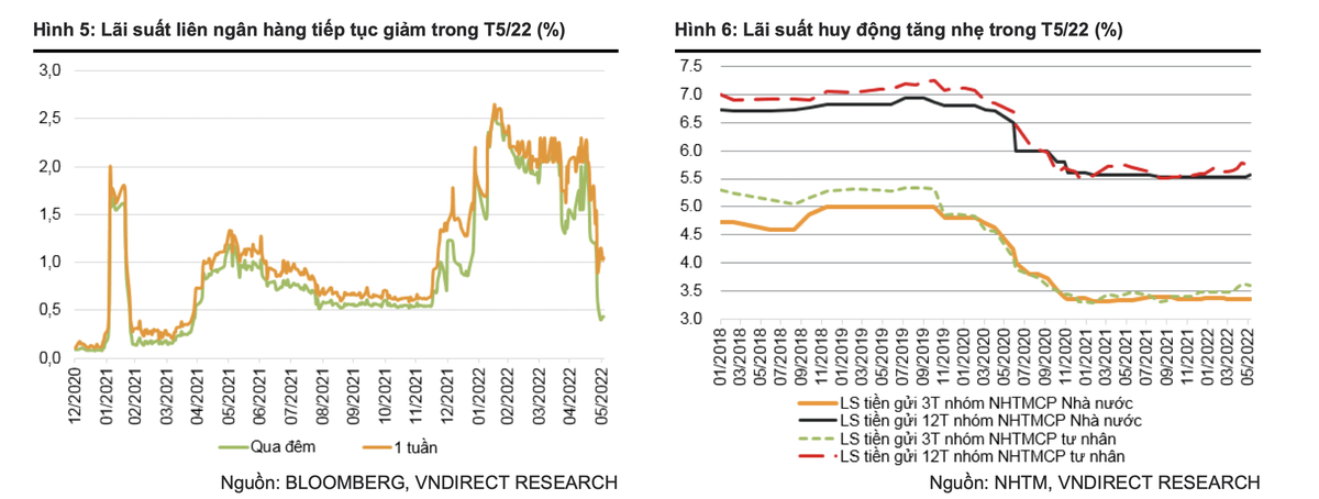 Thứ hai, lãi suất huy động (bằng VND) chịu áp lực tăng trong những tháng cuối năm. Tính đến cuối tháng 5/2022, lãi suất huy động kỳ hạn 3 tháng và kỳ hạn 12 tháng của các ngân hàng quốc doanh không đổi so với mức cuối năm 2021, trong khi lãi suất tiền gửi kỳ hạn 3 tháng và lãi suất huy động kỳ hạn 12 tháng của các ngân hàng tư nhân lần lượt tăng 20 điểm cơ bản và 23 điểm cơ bản so với mức cuối năm 2021.