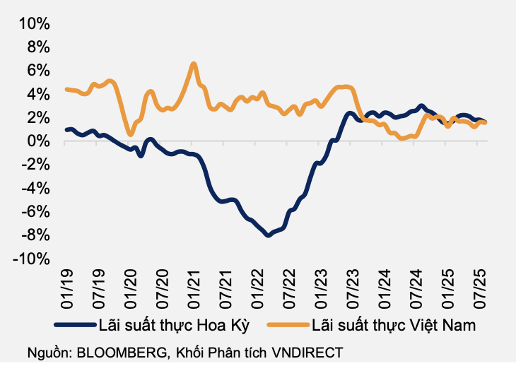 Đồng USD suy yếu và chi phí tín dụng toàn cầu giảm giúp Việt Nam giảm bớt áp lực nhập khẩu lạm phát. Tuy nhiên, nếu nới lỏng quá mức sẽ khiến lạm phát tại Mỹ dai dẳng hơn, có thể làm đảo ngược chu kỳ nới lỏng của Fed. Nhóm phân tích giữ nguyên dự báo CPI bình quân năm 2025 ở mức 3,3%. Các yếu tố hỗ trợ trong nửa cuối 2025 bao gồm: giá thịt lợn giảm nhờ tái đàn, chính sách miễn học phí, và tác động từ chỉ số giá sản xuất (PPI) của Trung Quốc giảm mạnh.