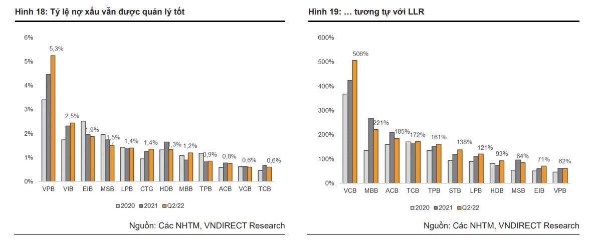 Điểm đáng chú ý, đó là những lo ngại về rủi ro nợ xấu tăng đột biến sẽ xảy ra trong nửa cuối năm 2022 khi Thông tư 14 không còn hiệu lực vào cuối tháng 6/2022. Tuy nhiên, theo VNDirect, vấn đề này sẽ không đáng lo vì chất lượng tài sản của các ngân hàng Việt Nam đã được cải thiện mạnh mẽ để đối phó với rủi ro này. Các ngân hàng đã tăng trích lập dự phòng rất mạnh mẽ và tỷ lệ bao nợ xấu đã đạt mức cao nhất lịch sử trong thời gian qua.