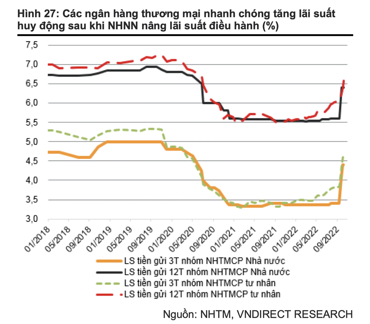 Sau khi NHNN tăng lãi suất điều hành thêm 100 điểm cơ bản cơ bản vào ngày 23/9, các ngân hàng thương mại đã nhanh chóng tăng lãi suất huy động VND. VNDIRECT cho rằng, lãi suất huy động sẽ tiếp tục tăng trong những tháng tới do tác động từ việc Ngân hàng Nhà nước tăng lãi suất chính sách. Cùng với việc chính thức điều chỉnh thêm hạn mức tăng trưởng tín dụng cho một số ngân hàng thương mại dẫn đến việc tăng về nhu cầu huy động vốn của các ngân hàng.