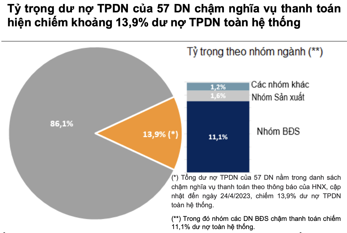 Cũng theo tổng hợp của VNDirect, tính đến ngày 24/4/2023, có khoảng 57 doanh nghiệp nằm trong danh sách chậm nghĩa vụ thanh toán lãi hoặc nợ gốc trái phiếu doanh nghiệp theo thông báo của HNX.