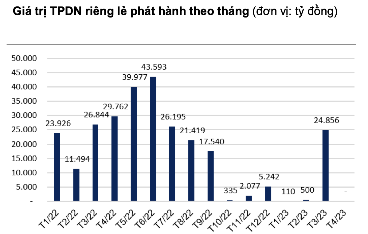 Theo thống kê của VNDirect, tính từ đầu tháng 4 cho đến ngày 24/04 không có đợt phát hành trái phiếu doanh nghiệp riêng lẻ mới nào được thực hiện. Trong khi hoạt động mua lại trước hạn cũng có sự chững lại, với hơn 4.833,1 tỷ đồng trái phiếu doanh nghiệp riêng lẻ được mua lại trước hạn trong tháng 4, tổng giá trị mua lại trước hạn trong 4 tháng đầu năm 2023 đạt hơn 39.388 tỷ đồng.